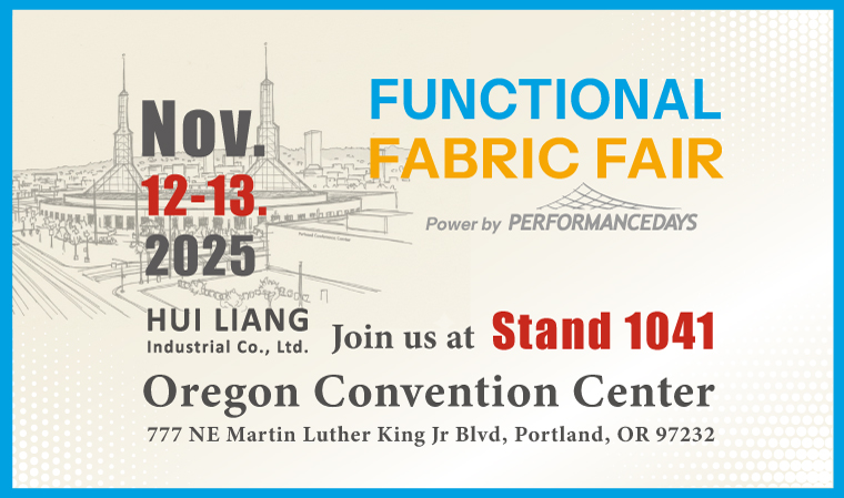 匯良將於 2025 年 11 月 12–13 日 參加在波特蘭 Oregon Convention Center 舉辦的Functional Fabric Fair,展位攤號 1041。
