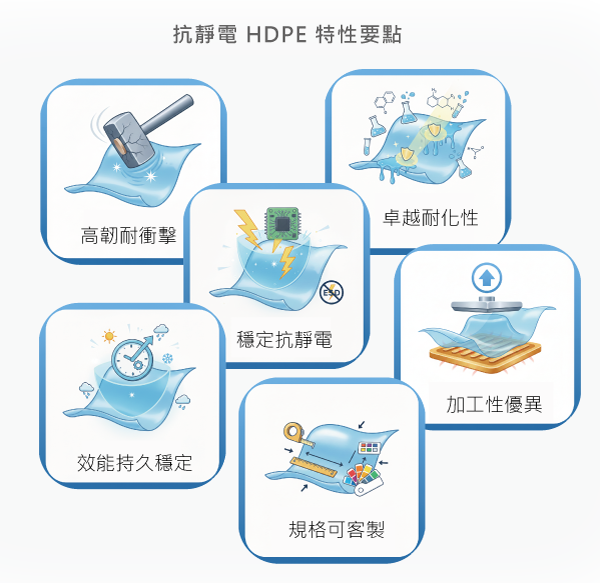 抗靜電 HDPE 板材專為真空吸塑與熱成型製程設計,具備穩定的靜電耗散效果與良好成型性。材料受熱均勻、延展性佳,可製作各類電子與工業用吸塑包材,有效降低製程與使用過程中的靜電累積風險,適合長時間與量產應用。