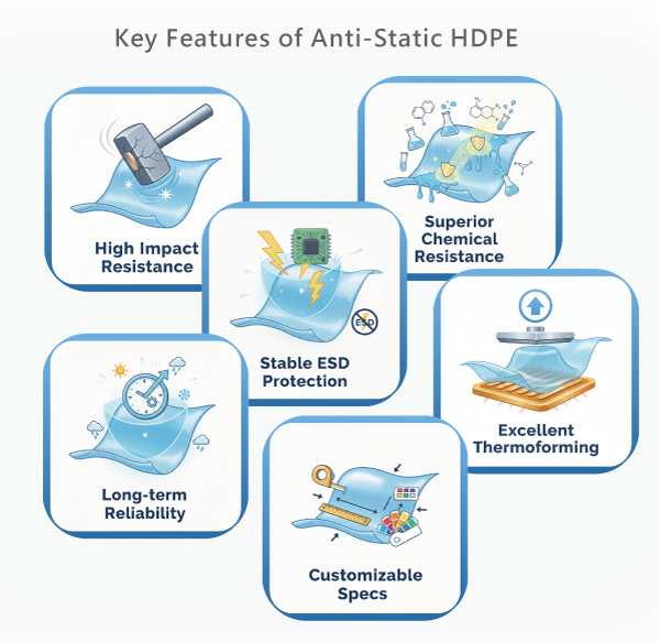 Antistatic HDPE sheets are specifically designed for vacuum forming and thermoforming processes, offering stable electrostatic dissipation performance and excellent formability. The material heats evenly and provides good elongation, making it suitable for a wide range of electronic and industrial thermoformed packaging. It effectively reduces the risk of static buildup during manufacturing and end use, making it ideal for long-term and mass production applications.